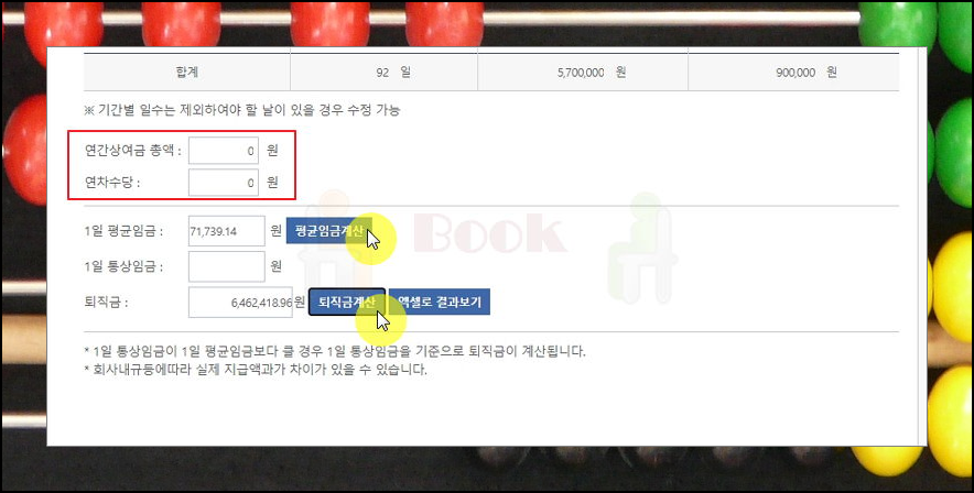 6. 상여금과 연차수당도 잊지 마세요. 퇴직금 액수에는 연간 상여금 총액과 연차수당도 영향을 미치는데요. 해당 항목에 대한 내용을 입력하고, [평균 임금 계산]과 [퇴직금 계산] 버튼을 클릭해 주세요. 그럼 간단하게 결과를 확인할 수 있어요.