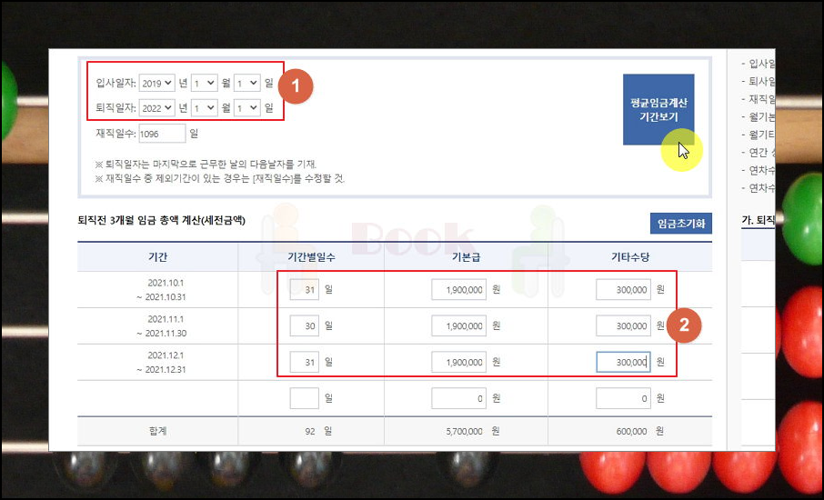 5. 입사부터 퇴직까지 정보를 넣어봐요. 계산기 프로그램이 나타났어요. 어떻게 이용하는지 설명해 드릴게요. 일단 입사일자와 퇴직일자를 정확하게 입력한 후 [평균임금계산 기간보기] 버튼을 클릭해 주세요. 그럼 재직일수가 자동으로 산출이 돼요. 그 다음으로 입력해야 하는 것은 퇴직전 3개월 임금 총액을 입력하는 일이에요. 세전 금액을 입력해야 하는데요. 각 기간에 맞게 기간별 일수, 기본급, 기타 수당을 차례대로 입력해 주세요.
