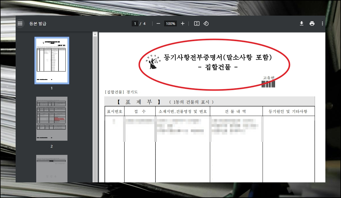 제가 방금 무료열람 서비스를 이용하여 받아본 인터넷 등기부등본 입니다. 총 4페이지로 되어 있고, 우리가 공공기관에 방문하거나 전용 사이트에서 받아보는 것과 동일함을 알 수 있어요.