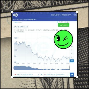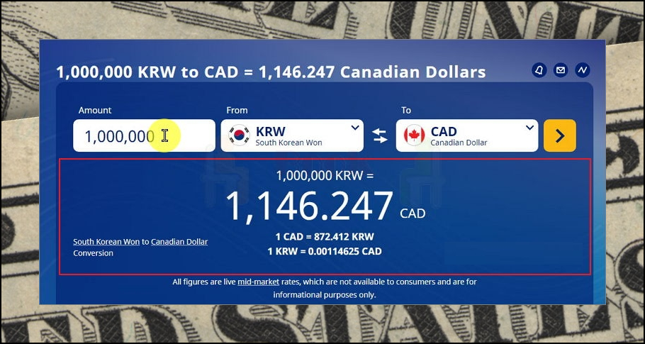 반대로도 캐나다 환율조회를 할 수 있는데요. From에 KRW를 입력하고, To에 CAD를 입력하면 돼요. Amount는 변환하고 싶은 금액을 넣어주면 되는데요. 100만원을 캐나다 통화로 환전하면 1146.247CAD가 된다고 하네요. 환전 수수료를 내야 하기 때문에 좀 더 적게 받을 거에요.