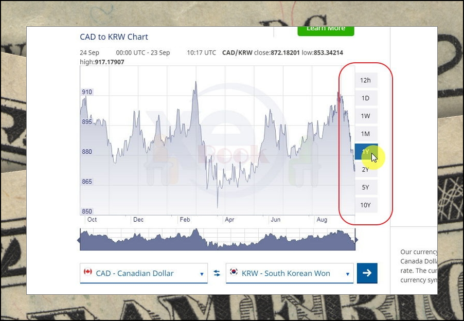 [View full CAD to KRW chart] 버튼을 클릭해 보세요. 그럼 큰 화면으로 나타난 차트를 확인할 수 있어요. 우측을 보면 시간과 날짜가 적혀 있는 버튼이 보이는데요. 버튼을 누르면 해당 기간 동안 캐나다 통화를 원화로 환산했을 때의 가격이 어떻게 변화했는지 알아볼 수 있어요.