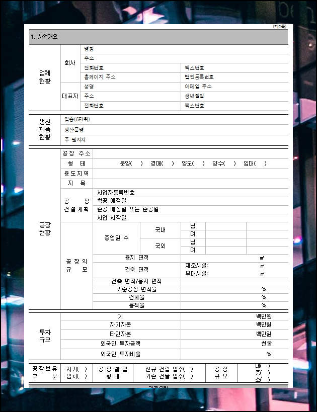다양한 업종에 따른 사업계획서 작성방법을 구체적으로 아는 방법이 있습니다. "회사의 기본 정보"부터 "세부적인 내용"까지 포함해야 할 요소들을 꼼꼼히 살펴볼 수 있는 방법이 있습니다. 특히 제조업의 경우 "생산하는 제품"과 "공장의 현재 상황", "향후 투자 규모" 등의 정보가 매우 중요한데요. 아래 첨부한 파일을 참고해 보세요. PDF 형식으로 제공되며, 필요시 무료 PDF 뷰어를 통해 쉽게 열람할 수 있습니다. 샘플을 통해 작성방법을 제대로 익힐 수 있죠.
