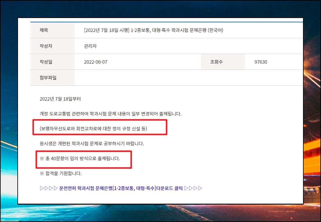 참고로 일정 시기마다 개정된 도로교통법에 관련해서 필기시험 문제의 일부 내용이 변경됩니다. 이전에는 보행자우선도로회전교차로에 대한 정의 규정 신설 등의 부분이 반영이 되어 있는데요. 제가 첨부한 자료는 해당 부분이 업데이트 되어 있으니 참고 바랍니다.