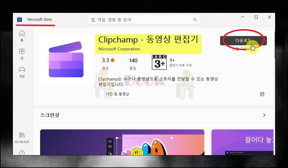 일단 동영상에 자막 넣기 위해서 프로그램을 하나 설치해야 합니다. 무료로 설치하고, 사용할 수 있는 프로그램인데요. 윈도우의 "Microsoft Store" 앱을 실행한 후 "Clipchamp"를 검색해서 동영상 편집기 프로그램을 찾아주세요. 그 다음 [다운로드] 버튼을 누르면 설치까지 진행이 됩니다.