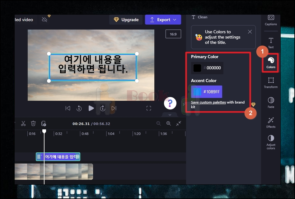 동영상에 넣은 자막에 대한 색깔을 변경하는 것도 가능합니다. "Color" 메뉴를 선택해보세요. 그럼 색을 지정할 수 있게 되는데요. 글자의 색과 텍스트 주변색을 변경할 수 있습니다.