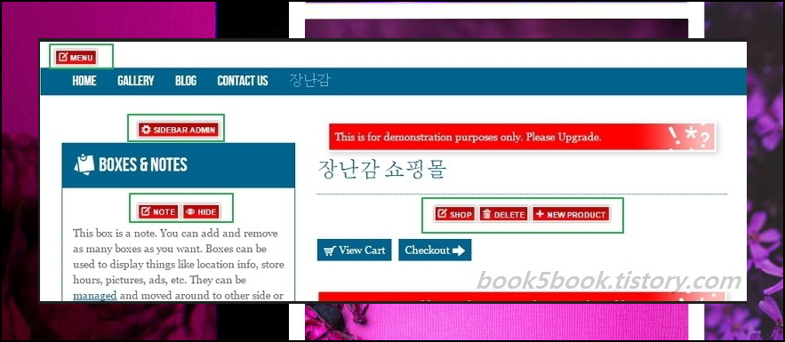 장난감 쇼핑몰에 상품을 추가해봤어요. 우리가 많이 보는 쇼핑몰과 같이 전문적이진 않지만 상품소개 용도로는 깔끔하고 좋습니다. 왼쪽 사이드바에는 회사에 대한 정보를 넣었는데요. 깔끔하죠? 모든 것이 버튼을 누르고 넣고 싶은 내용을 입력하는 방식이라 이러한 프로그램을 처음 이용하시는 분도 쉽게 사용하실 수 있답니다.