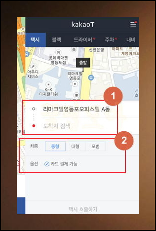 스마트폰 어플을 통해 콜택시 부르는법은 매우 간단합니다. 출발지와 도착지를 지정한 후 차종과 옵션을 선택한 뒤 "호출하기" 버튼을 클릭하면 돼요. 기본적으로 출발지는 현재 위치로 설정이 됩니다.