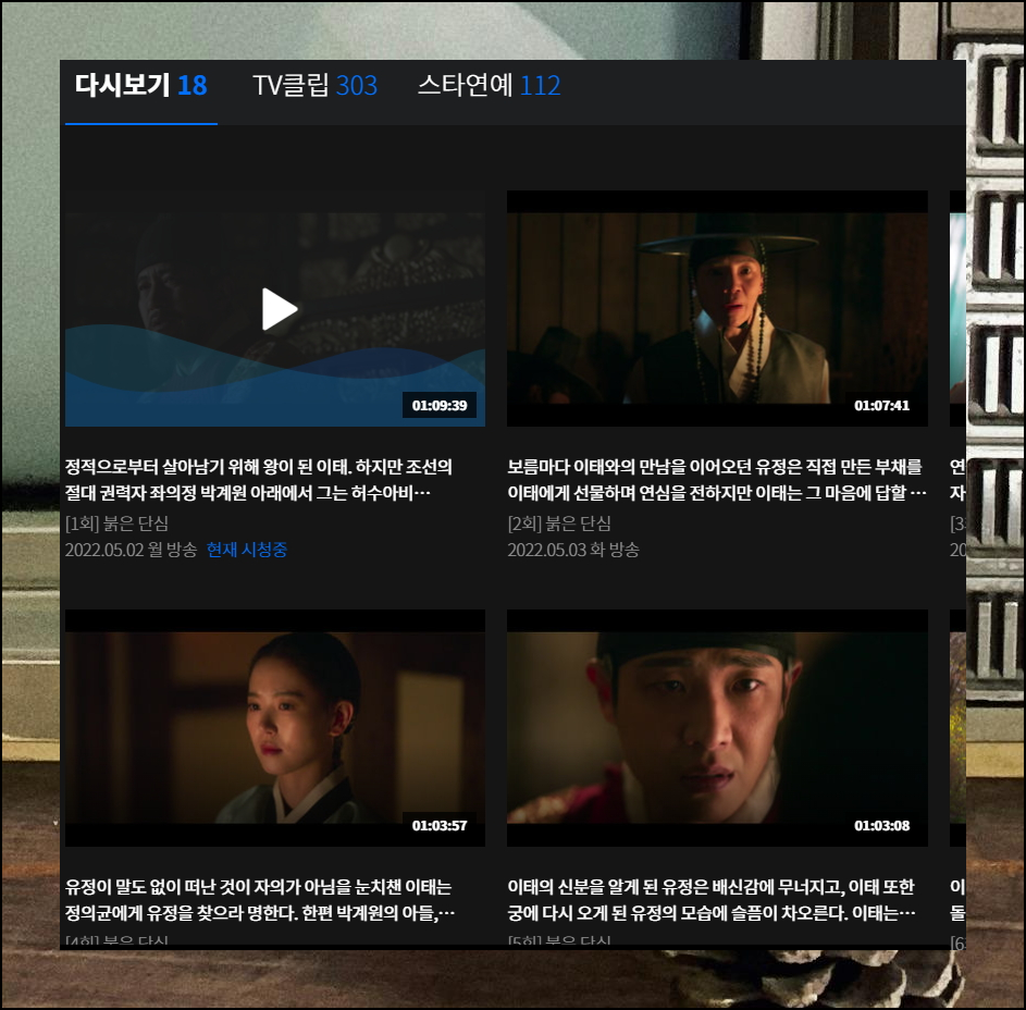 요즘에는 퓨전 사극이 인기가 있는데요. kbs2에서 방영이 되었던 과거의 명작 드라마를 완벽하게 즐기실 수 있습니다. "연모"부터 "녹두전"까지 한 때 많은 인기를 끌었던 작품을 다시보기 할 수 있어요. 각 작품마다 줄거리와 출연진 정보도 상세하게 제공되고 있답니다.