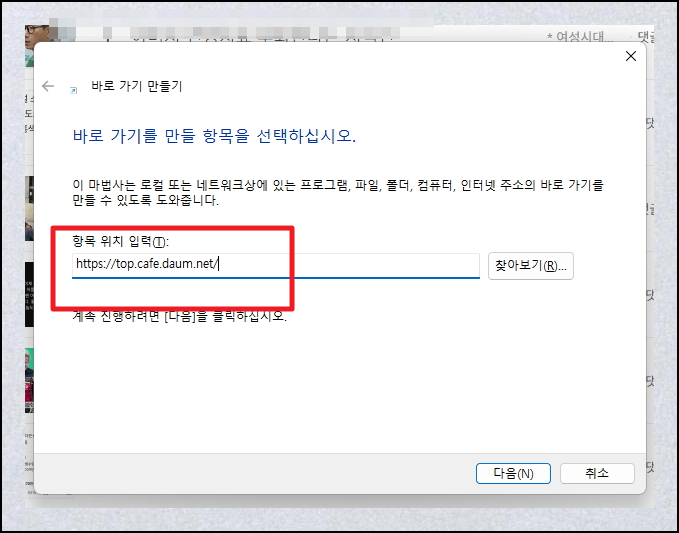 바로가기 생성 창이 나타나면 "top.cafe.daum.net" 주소를 입력하고 다음 단계로 진행해 주세요.