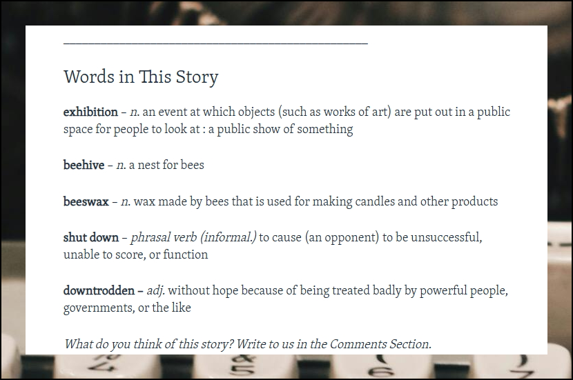 이곳에서 제공하는 학습자 친화적인 기사들이 학습에 여러 모로 도움됩니다. 모르는 단어는 기사 하단에 있는 영영사전으로 찾아보면 영어적 사고를 기를 수 있어요. 문맥 속에서 단어의 의미를 파악하는 것도 영어회화를 잘하는 방법 중 하나죠.