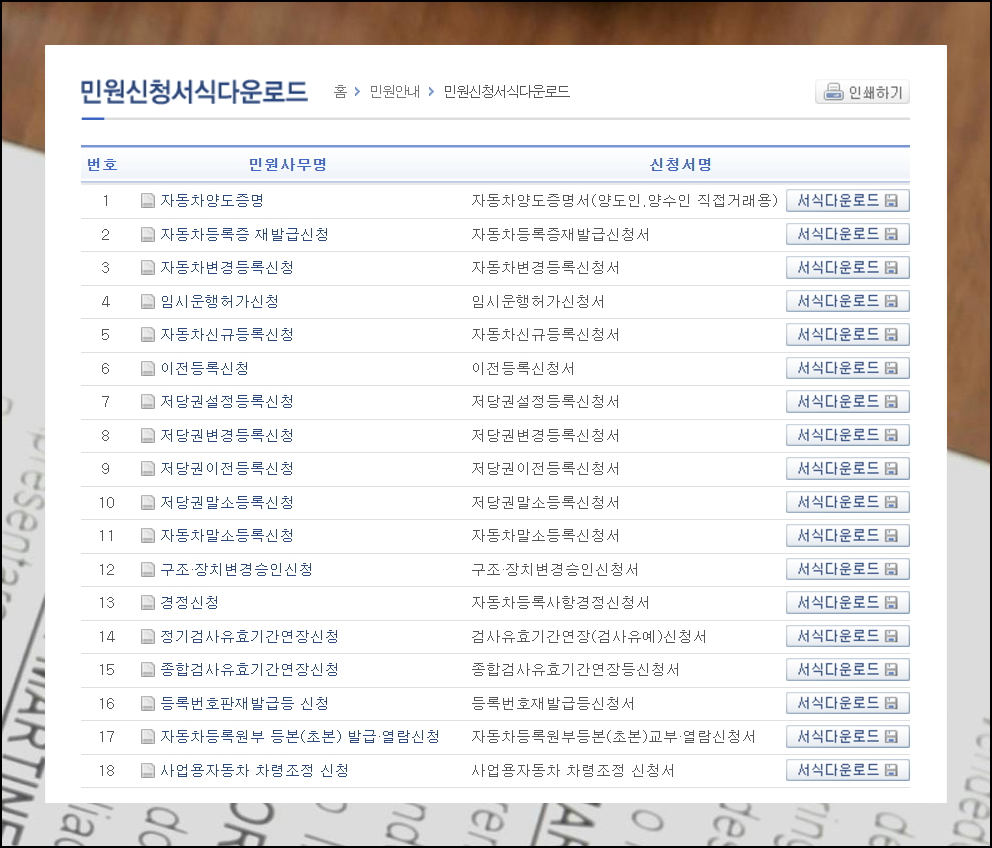 자동차 등록 민원안내 메뉴로 이동하신 후 민원신청서 서식 다운로드를 선택해주세요. 매매계약서 양식뿐만 아니라 등록증 재발급신청서, 신규등록신청서 등 다양한 서식 파일을 무료다운으로 받아보실 수 있습니다.
