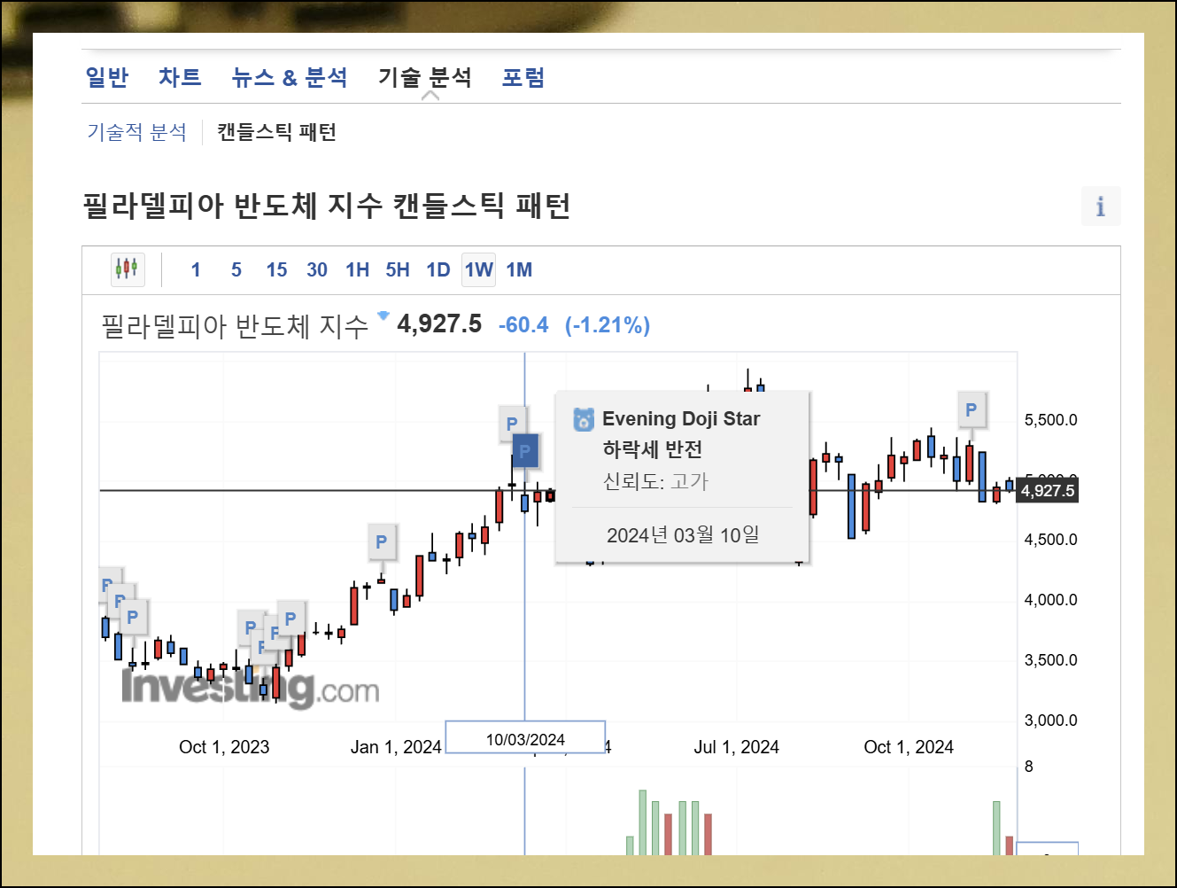 캔들스틱 패턴은 방향성과 함께 신뢰도, 자세한 설명을 제공하여 처음 시작하는 분들도 쉽게 이해하고 활용할 수 있습니다. 필라델피아 반도체지수의 분석이 한결 수월해져요.
