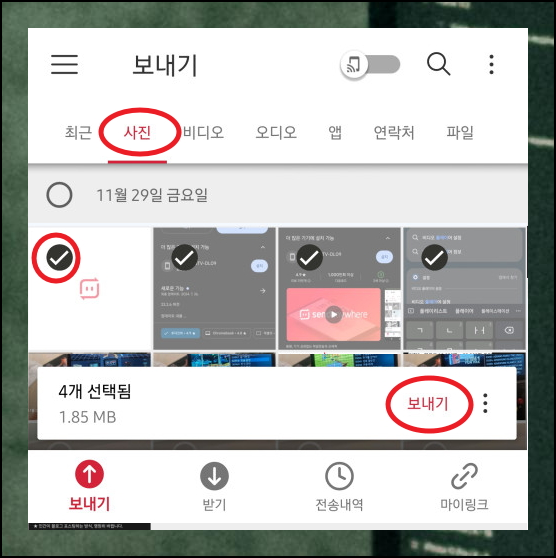 전송 과정은 매우 직관적입니다. 핸드폰에서 원하는 사진을 선택하고 하단의 전송 버튼을 누르면 6자리 코드가 생성됩니다. 이 코드로 컴퓨터로 옮기는 작업을 진행할 수 있어요.