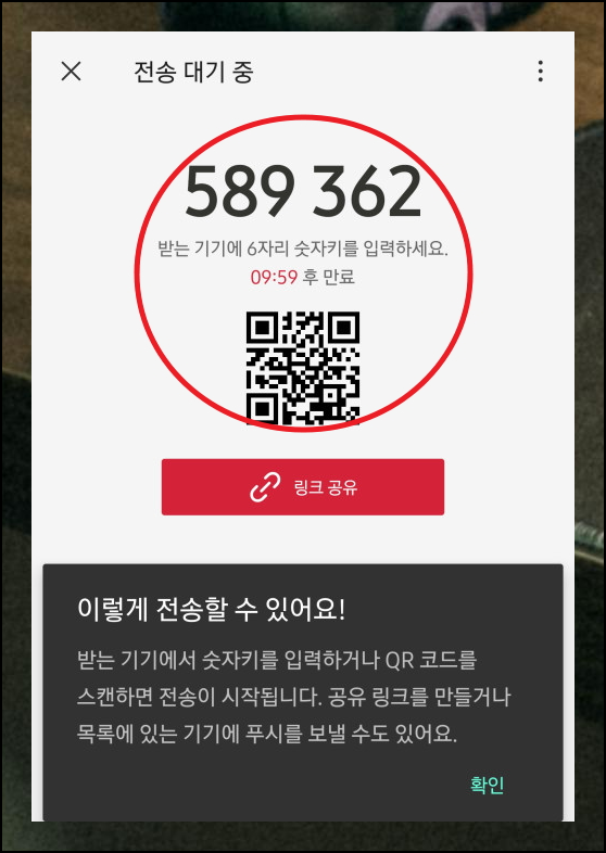 전송 과정은 매우 직관적입니다. 핸드폰에서 원하는 사진을 선택하고 하단의 전송 버튼을 누르면 6자리 코드가 생성됩니다. 이 코드로 컴퓨터로 옮기는 작업을 진행할 수 있어요.