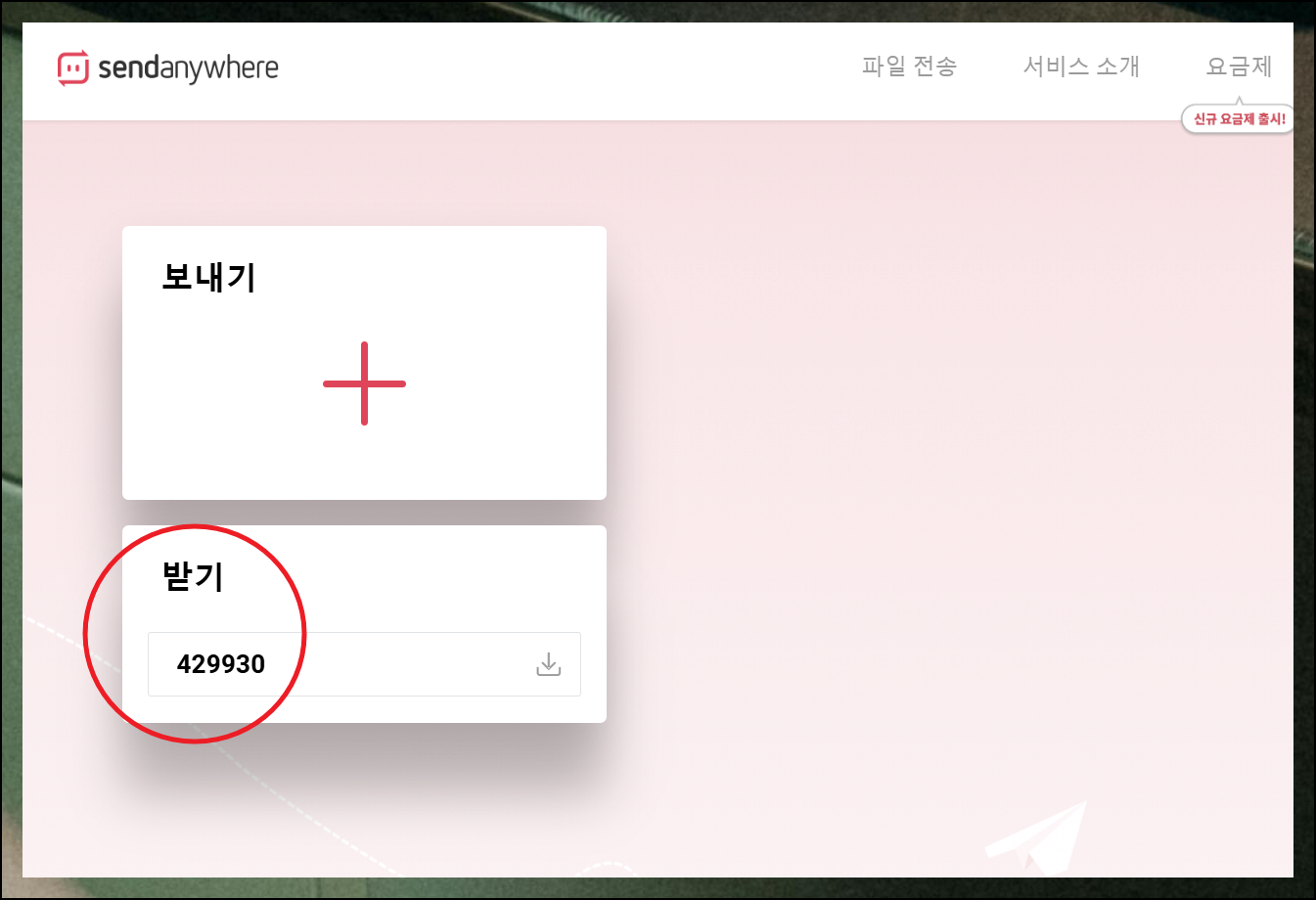 웹사이트 메인 화면의 받기 섹션에서 방법을 확인할 수 있어요. 핸드폰의 사진을 컴퓨터로 전송하기 위해 앱에서 받은 6자리 코드를 입력하면 됩니다.