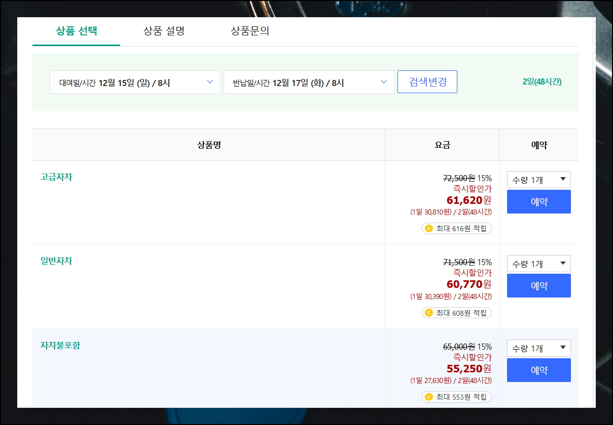 대표적인 렌트카 업체인 SK를 기준으로 시세를 분석해보았어요. 제주도에서 2박 3일 기준 모닝 차량은 13만원 선에서 형성되어 있습니다. 일부 사이트의 경우에는 회원가입을 통해 추가 할인 혜택을 받을 수 있으니 참고하세요. 물론 시기별로 차이가 있을 수 있으니 예약 전 재확인이 필요합니다. 특히 성수기에는 제주도 렌트카 가격이 크게 오르니 미리 예약하면 저렴한곳을 이용할 수 있어요.