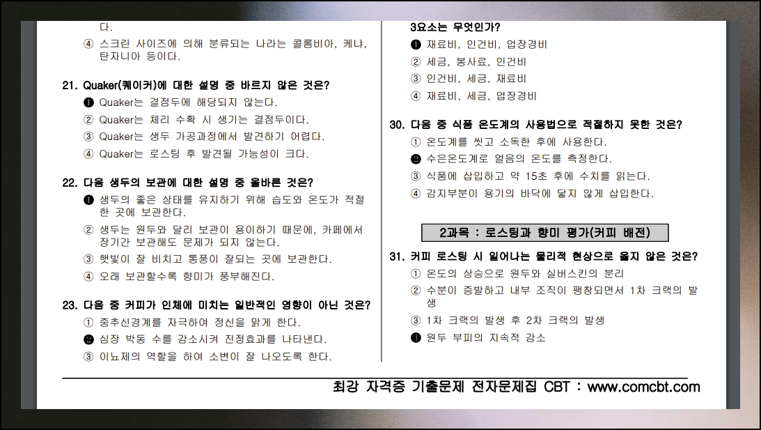 학생용 기출문제집은 순수하게 질문지만 먼저 나와 있는데요. 실제 시험처럼 풀어보면서 자신의 실력을 점검할 수 있습니다. 바리스타 2급 자격증 취득을 위한 실전 감각도 키울 수 있어요.
