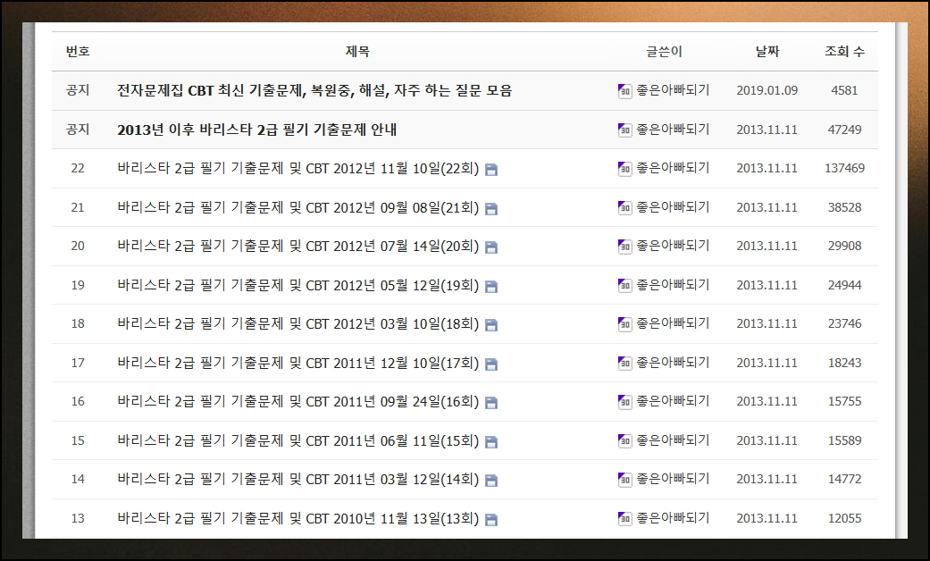 회차별로 정리된 기출문제들이 있는데요. 최신 자료는 없지만 커피 관련 내용은 크게 변하지 않아서 충분히 학습 자료로 활용할 수 있습니다. 바리스타 2급 시험 준비에 실질적인 도움이 될 거예요.
