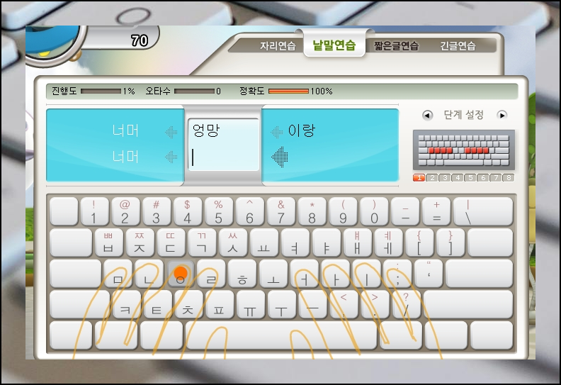 시각적으로 손가락 위치를 보여주어 자리 익히기에 수월합니다. 실시간으로 오타와 정확도가 표시되어 실력 향상을 확인할 수 있어요.