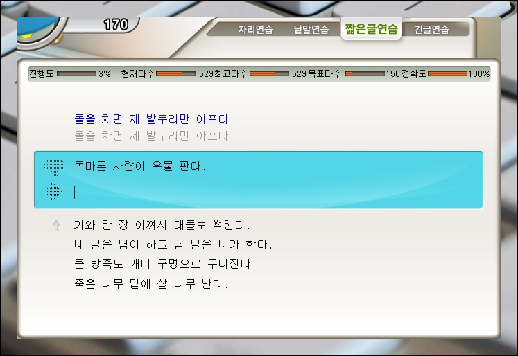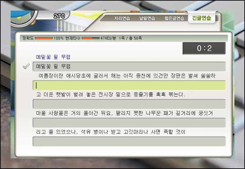 실력이 늘면 긴 글 익히기 단계로 넘어가세요. 타자연습의 궁극적인 목표는 긴 문장을 빠르고 정확하게 입력하는 것입니다. 여러 지표를 통해 자신의 발전 상황을 체크하면서 연습할 수 있습니다.