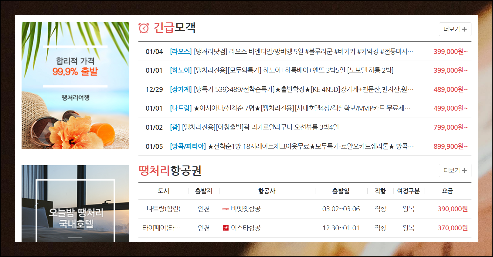 사이트에 들어가시면 메인 화면을 조금만 내려보세요. 해외여행 긴급모객과 땡처리항공권 메뉴를 쉽게 찾으실 수 있어요. 두 가지 모두 좋은 기회지만, 오늘은 먼저 패키지 상품을 중심으로 설명해드리도록 하겠습니다.