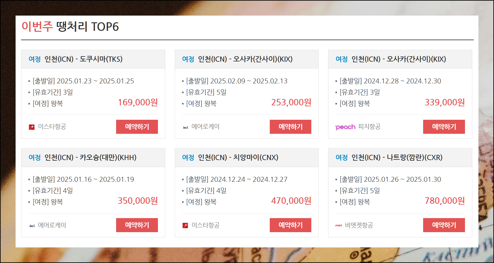 휴가철이 다가오면 여행 항공권 구하기가 하늘의 별 따기가 됩니다. 하지만 걱정마세요. 이번 주 땡처리 TOP6를 확인해보세요. 긴급하게 판매하는 만큼 일반 요금보다 훨씬 저렴하게 구매하실 수 있어요.