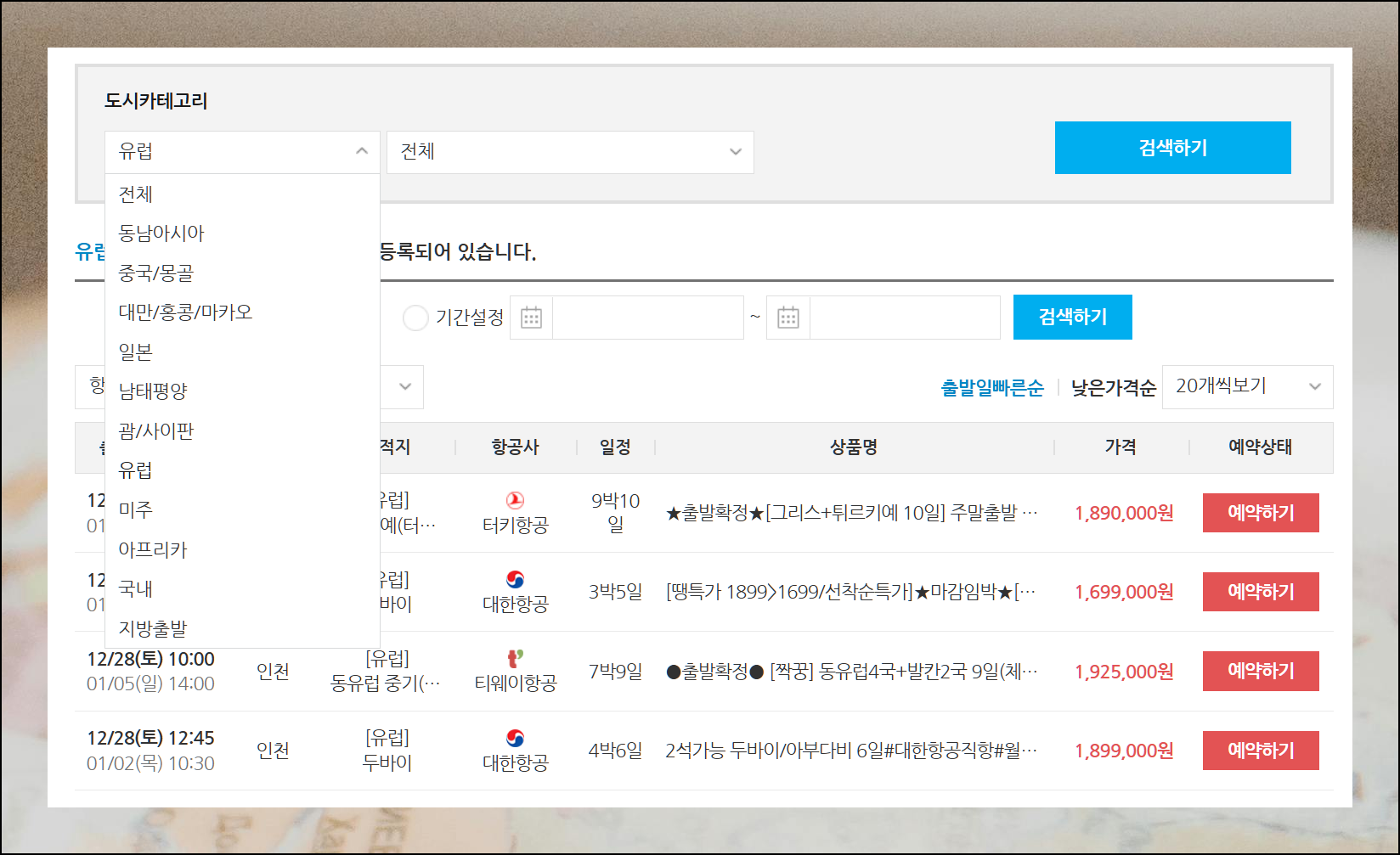 상품 목록을 보실 때는 꼭 가격순으로 정렬해보세요. 출발일이 가까워졌다고 무조건 싸지는 않아요. 낮은 가격순으로 보면서 꼼꼼히 비교하는 것이 현명합니다. 대부분 일주일 안에 출발하는 여행상품이 많으니 이 점 참고하시구요. 출발 여유가 있는 상품은 가격이 더 나갈 수 있다는 걸 기억하세요.