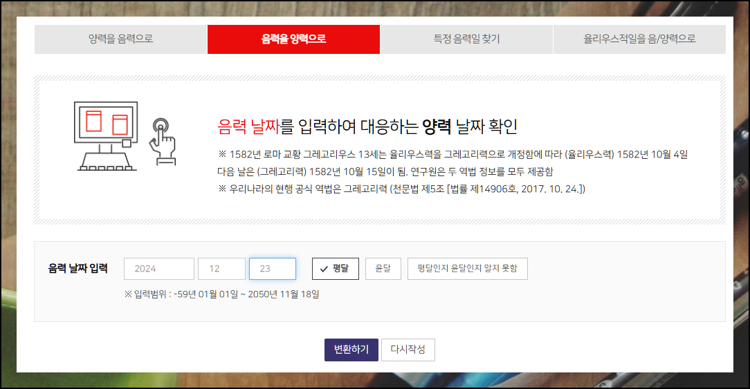화면 상단에서 원하는 날짜 변경 방식을 고르세요. 음력에서 양력으로 바꾸려면 두 번째 메뉴를 선택합니다. 생일 날짜를 입력하고 평달, 윤달 여부도 체크해주세요. 정확한 변환을 위해 꼭 확인하세요.