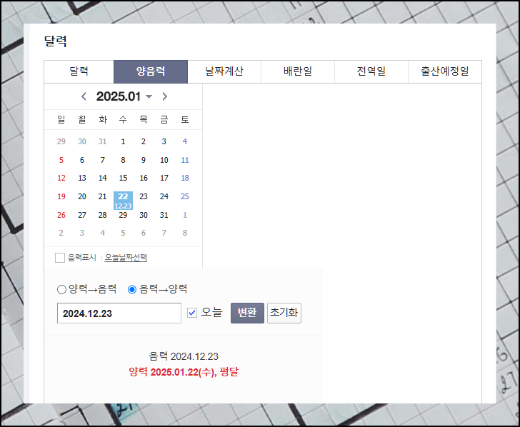 다음 달력에서는 음양력 변환은 물론 평달과 윤달 구분도 가능합니다. 생일 외에도 배란일이나 출산예정일도 계산할 수 있어요.
