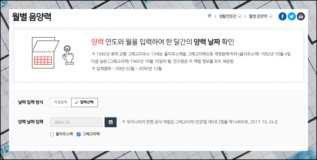 원하는 연도와 월을 입력하면 해당 월의 모든 음력 정보를 확인할 수 있습니다. 한 달 전체의 음양력 대응표가 나타나요.