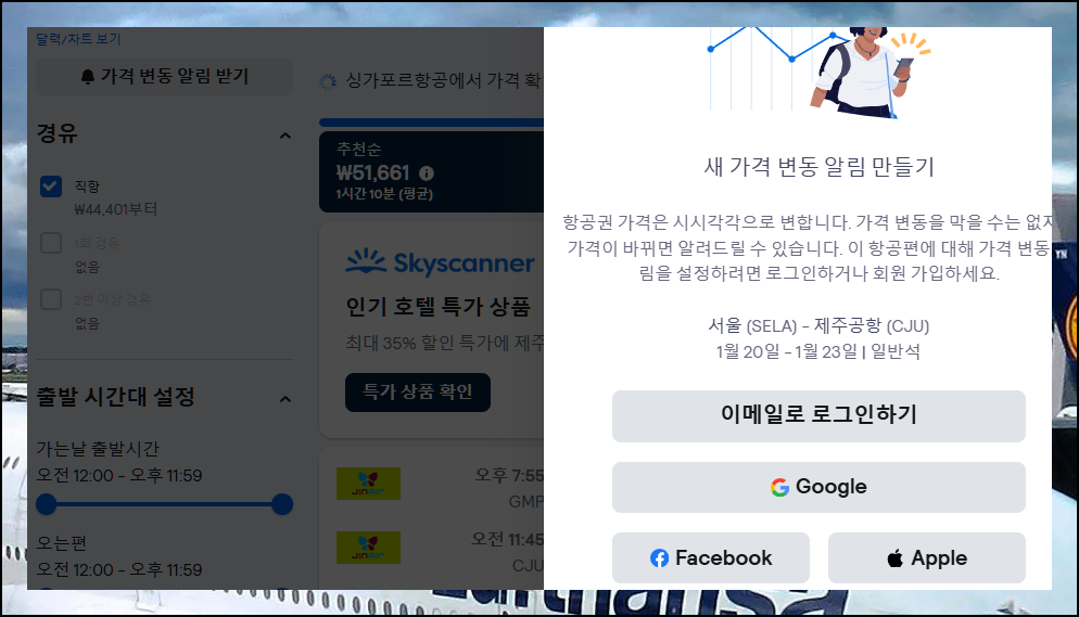 지금 당장 예약하지 않더라도 기회를 놓치지 마세요. 좌측 상단의 가격 변동 알림 기능을 설정하면 특가 항공권 정보를 이메일로 받아볼 수 있어요. 이를 통해 더 저렴한 가격에 구매할 수 있는 기회를 잡을 수 있습니다.