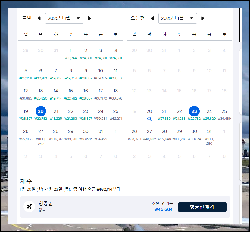 2025년 1월을 예시로 들어볼까요? 날짜 조정 보기를 선택하면 각 날짜별 가격이 한눈에 보여요. 20일 출발, 23일 귀국으로 설정해보니, 항공권이 45,564원이라는 놀라운 가격을 발견했습니다. 이런 방식으로 원하는 날짜의 예약을 쉽게 확인할 수 있어요.