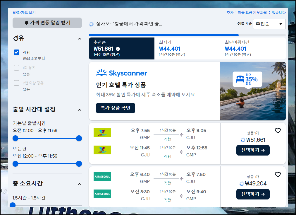 날짜를 정했다면 이제 시간대를 선택할 차례입니다. 같은 날이라도 출발 시각에 따라 항공권 가격이 천차만별이에요. 화면 좌측의 시간대 필터를 활용하면 원하는 시간대에서 가장 경제적인 항공편을 찾을 수 있습니다.