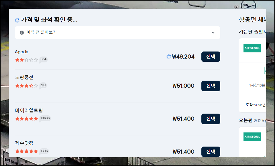 마음에 드는 항공권을 발견했나요? 항공편 목록 오른쪽의 선택 버튼을 클릭하세요. 예약 진행 전 업체 사이트를 선택해야 하는데요. 가격이나 평점을 기준으로 신뢰할 수 있는 곳을 고르면 됩니다.