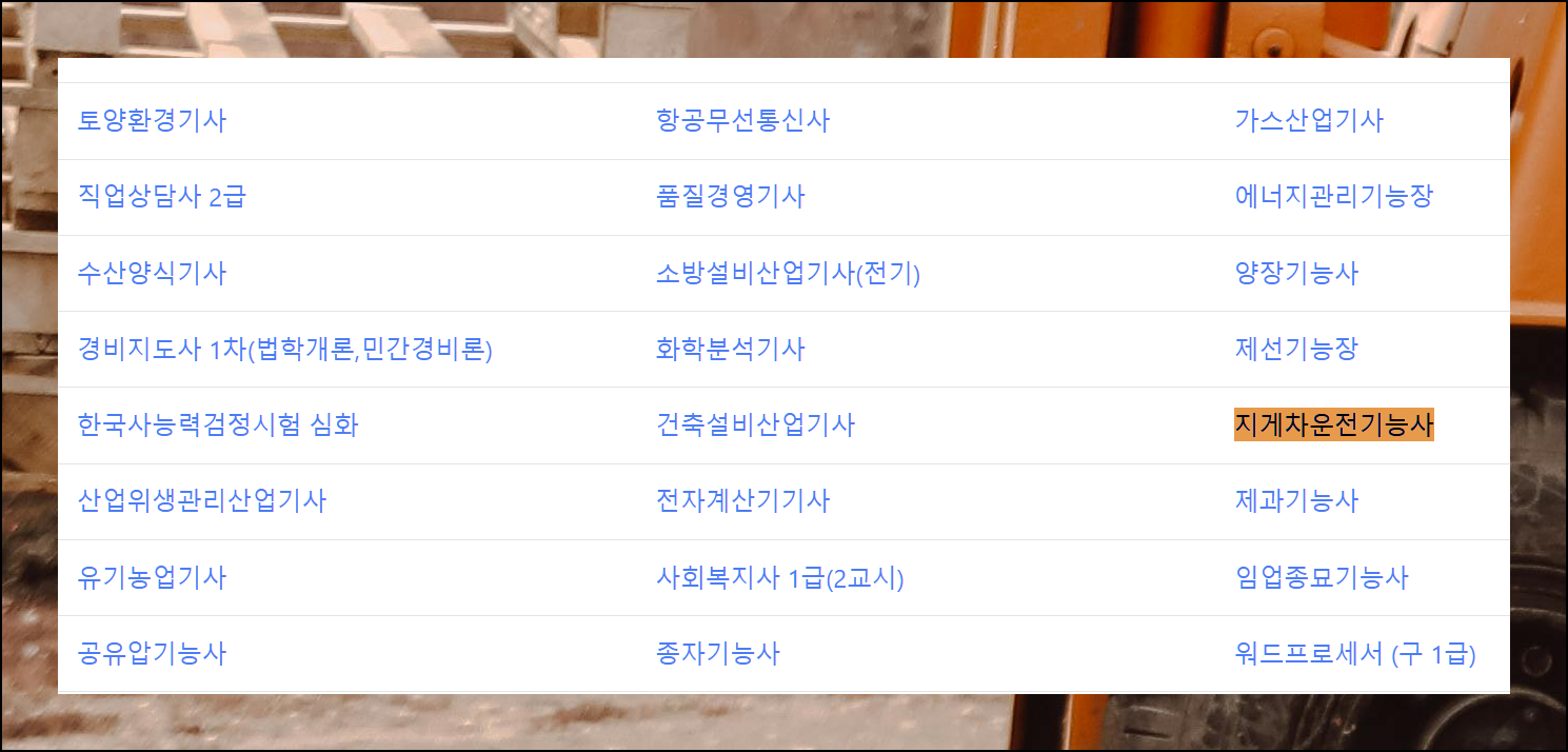 웹디자인부터 항공기관정비까지 여러 자격증 메뉴가 있어요. 그중에서 "지게차 운전기능사"를 선택하면 됩니다.