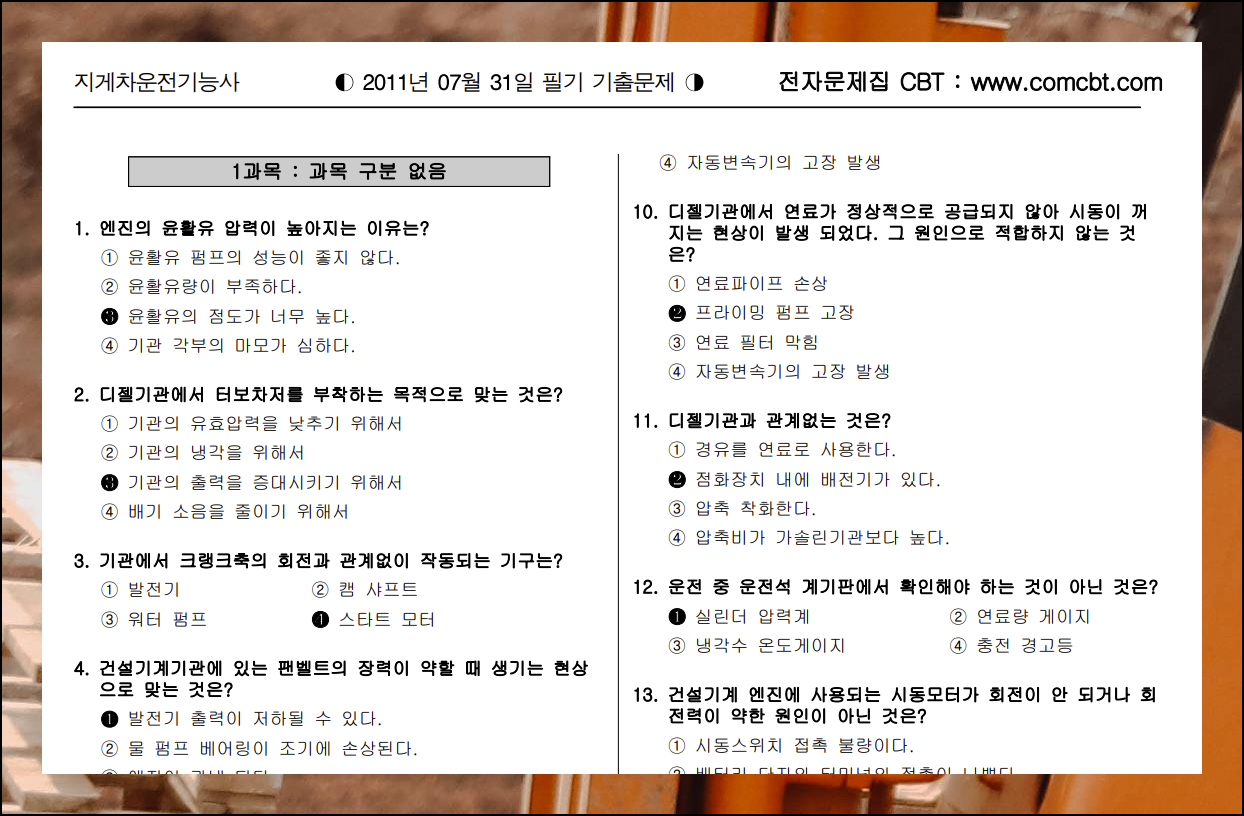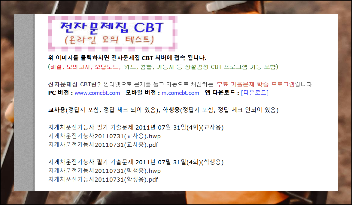 HWP와 PDF 형식의 기출문제를 얻을 수 있어요. comcbt 사이트에서눈 지게차 운전기능사 기출문제 자료를 무료로 다운받을 수 있습니다.