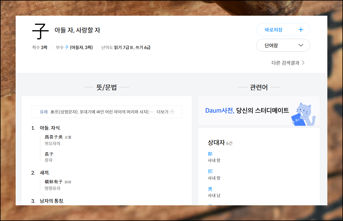 게다가 찾은 한자의 뜻뿐만 아니라 관련 단어, 성어, 부수까지 한 번에 확인할 수 있어서 더욱 효율적이에요.