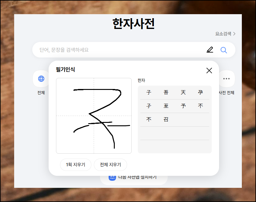 한문사전 검색을 진행할 때 꽤 유용한 서비스는 필기인식 기능이에요. 화면 중앙에 있는 펜 모양의 버튼을 누르고 원하는 한자를 그려보세요. 옆에 뜨는 문자 중에서 골라보세요.
