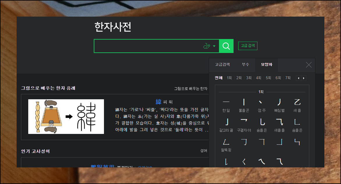 고급 검색 기능을 활용하면 더욱 편리해요. 음, 획수, 부수 등 다양한 방법을 사용할 수 있습니다. 부분 검색도 있으니 활용해보세요.