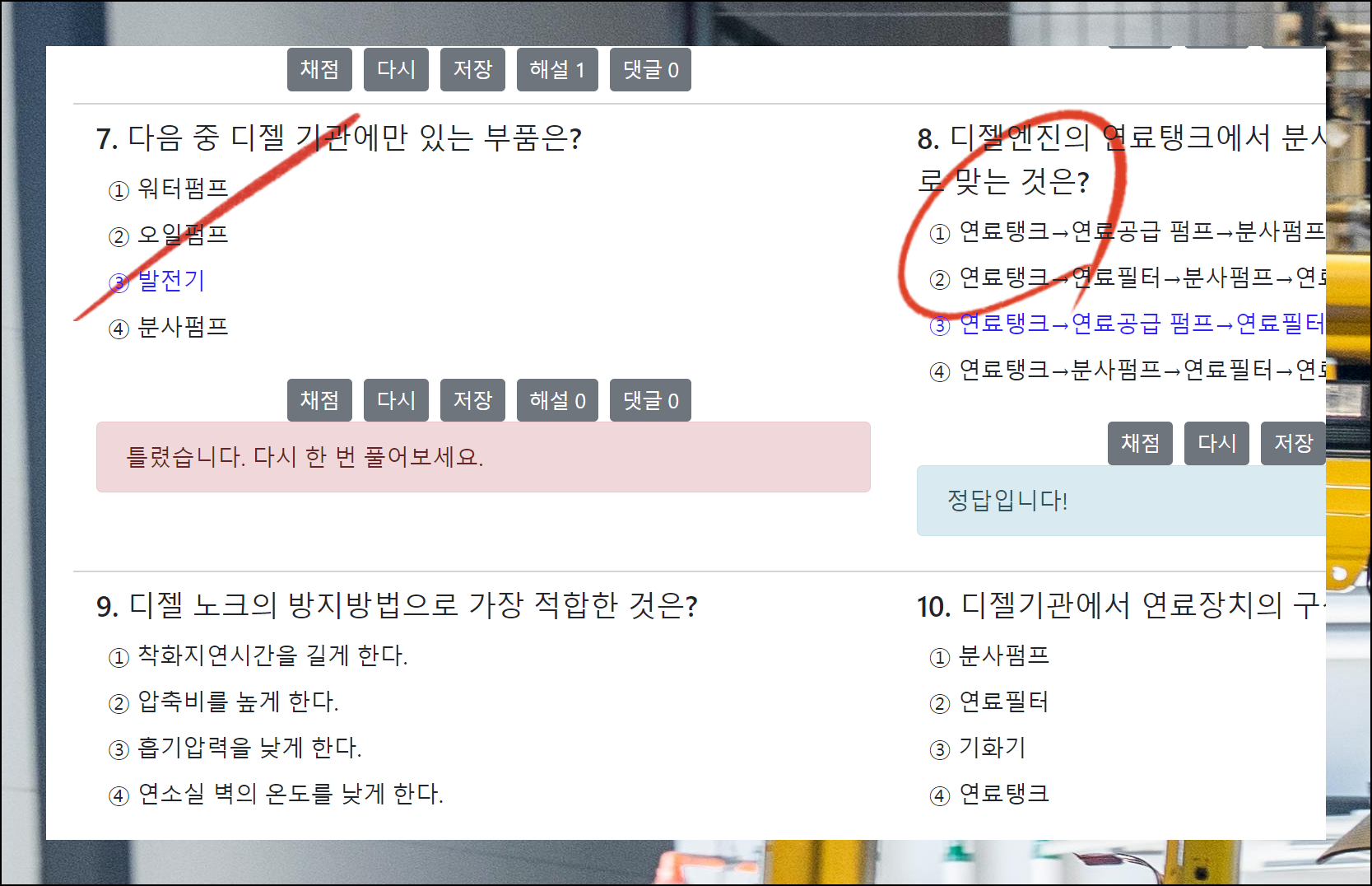 실제 운전에 필요한 핵심 지식을 담은 필기시험 문항들이 나와요. 문항을 풀고 채점 버튼을 누르면 바로 결과를 알 수 있습니다. 다른 응시자들의 정답률도 볼 수 있어 취약한 부분을 파악하기 좋습니다.