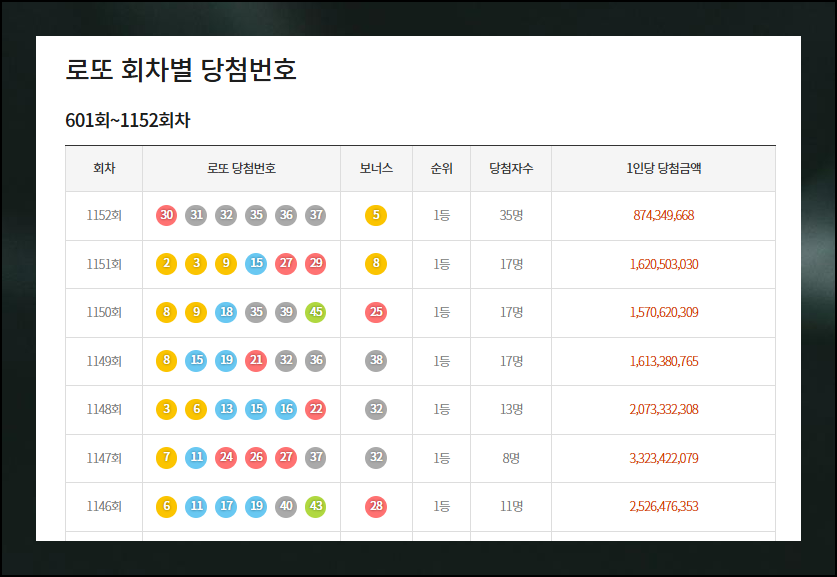 최근 회차의 로또당첨번호부터 보너스 숫자까지 모든 정보가 있어요. 전체모음 데이터를 통해 순위별 수령 금액과 게임 수도 쉽게 파악할 수 있습니다. 엑셀로 정리된 자료라 분석하기도 좋죠.