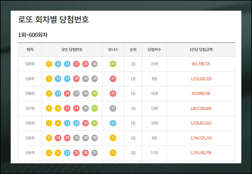 로또당첨번호에서 4등은 5만원 그리고 5등은 5천원으로 소액이지만, 기분 좋은 금액을 수령할 수 있습니다. 전체모음 데이터를 보면 2등의 경우 5자리와 보너스 숫자가 일치하면 5천만원대의 당첨금을 받을 수 있어요. 꿈같은 순간이 여러분을 기다리고 있습니다.