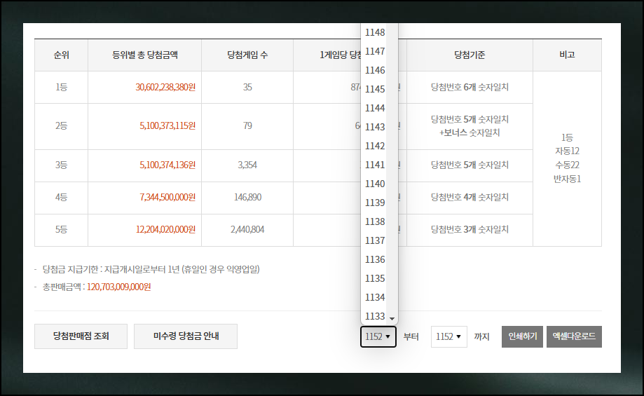 로또당첨번호 전체모음 엑셀 다운로드 및 1등, 2등 판매점 찾기