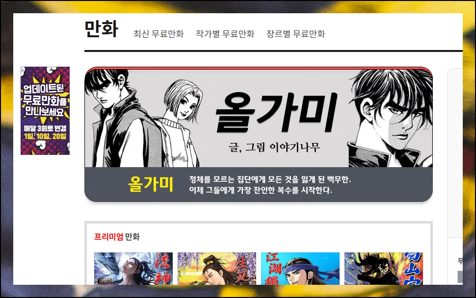 특별한 퀄리티를 자랑하는 프리미엄 시리즈를 무료로 만나보세요. 스포츠경향의 자객전서와 십별귀가 독자들의 마음을 사로잡았네요. 특히 무협 장르가 상위권을 독차지하고 있어 무협 만화 팬이라면 놓치지 말아야 할 콘텐츠예요.