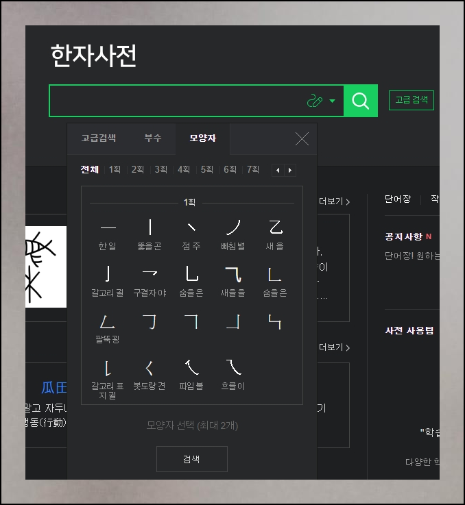 사전 검색을 진행하는 과정에서 결과가 많이 나올 땐 획수로 범위를 좁혀보세요. 우측 획수 옵션을 활용하는 방법으로 더 정확한 결과를 얻을 수 있습니다. 이런 방법으로 원하는 한자를 빠르게 찾아보세요.