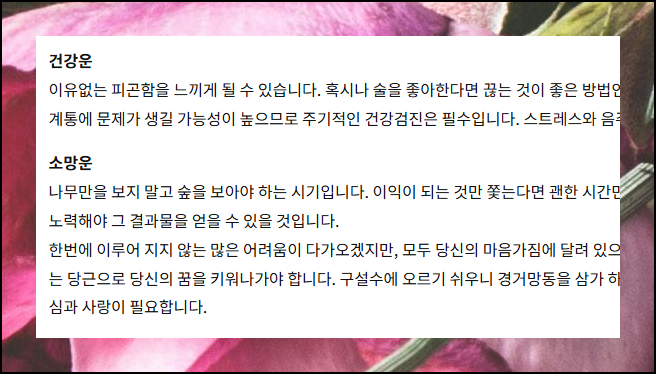 2025년 종합운이 상세하게 나와요. 재물운과 복록운이 좋다고 하니 기대가 되네요. 현대인으로서 맹신하진 않지만, 적당한 선에서 보면 긍정적인 마음가짐을 갖는데 도움이 될 수 있어요.