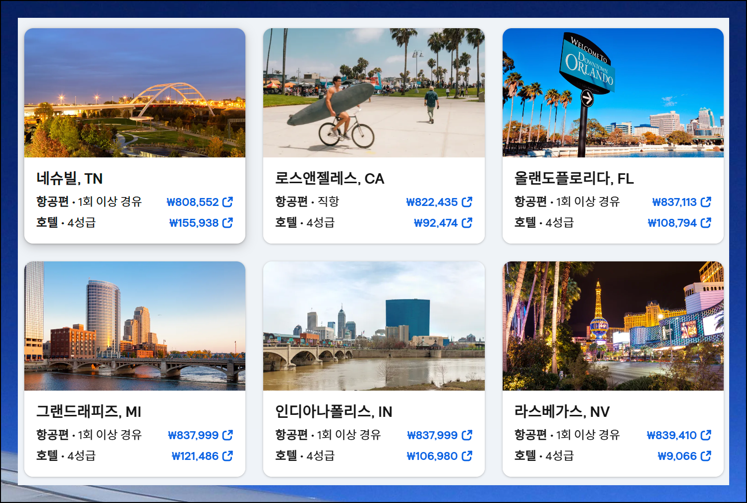 저는 도착지를 "미국"으로 지정했는데요. 이렇게 하면 미국의 각 도시에 있는 공항을 기준으로 국제 비행기표 예약 금액을 비교할 수 있습니다. 여기 표시된 것은 최소가를 나타내는데요. 서로 요금 비교를 통해 어떤 도시를 선택할 지 생각해보시길 바랍니다. 이런 식으로 스카이스캐너 사이트를 통해 쉽게 비교하고, 최적의 선택을 할 수 있게 됩니다.