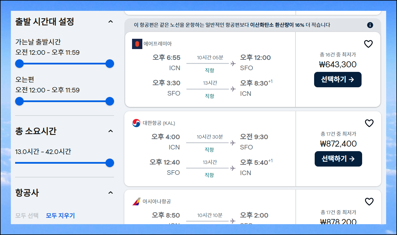 이번에는 출발 시간대와 경유 또는 직항 선택을 합니다. 그럼 사이트 화면 오른편에 여러 항공편에 대한 리스트가 나타나는데요. 여기서 마음에 드는 것을 선택하면 예약 진행도 가능합니다. 정렬 기능을 통해 가장 싸거나 스카이스캐너 사이트에서 추천해주는 곳을 선택하면 돼요.