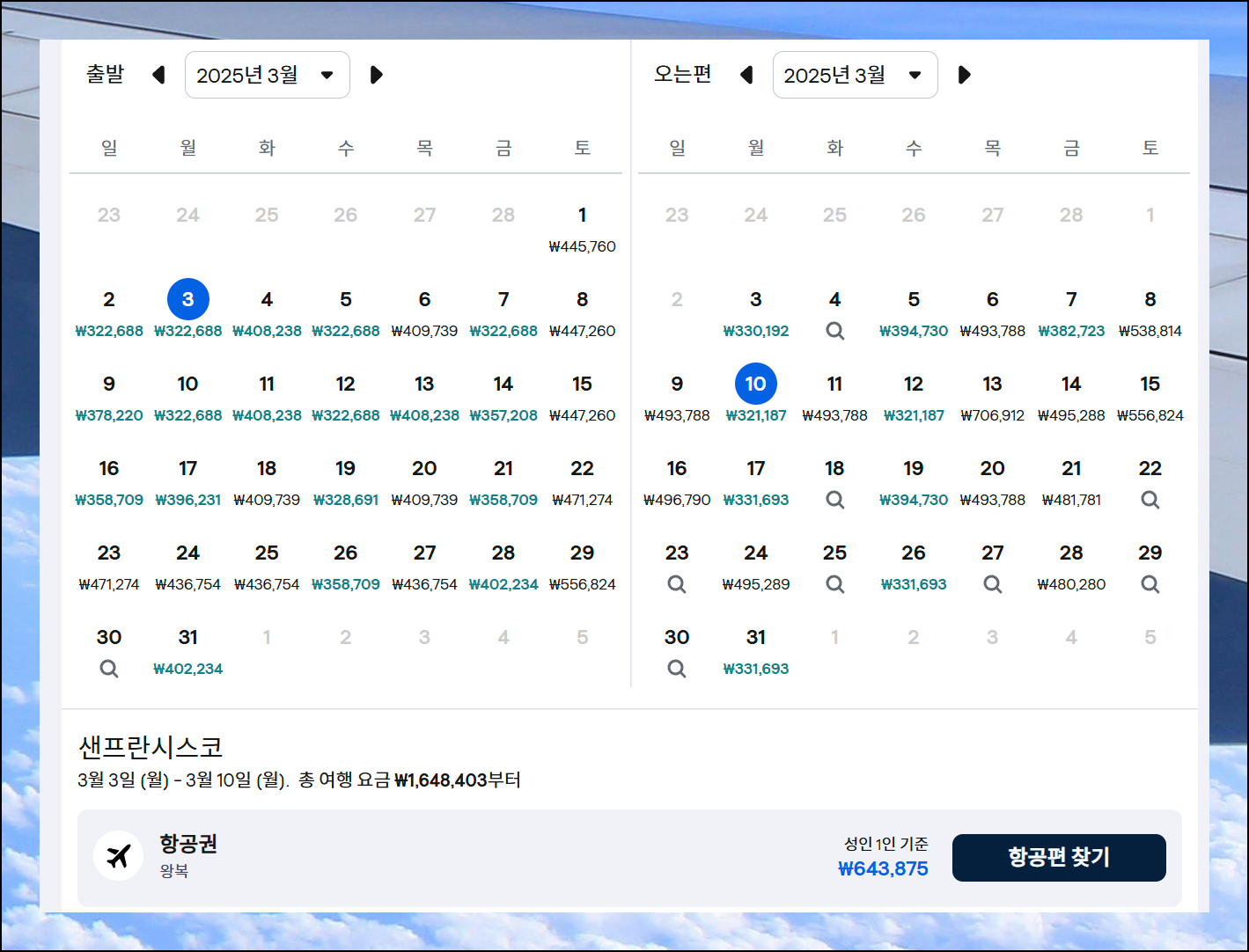 이번에는 날짜에 따라 언제가 국제 비행기표를 저렴하게 예약할 수 있는지 알아보는 단계에요. 보시는 바와 같이 출발 날짜와 도착 날짜를 선택할 수 있게 되어 있습니다. 하나씩 눌러보고 자신의 여행 스케쥴을 감안하여 가장 마음에 드는 가격의 날짜를 선택하면 됩니다. 저는 센프란시스코 왕복 비행기표를 643,875원에 찾을 수 있었어요.