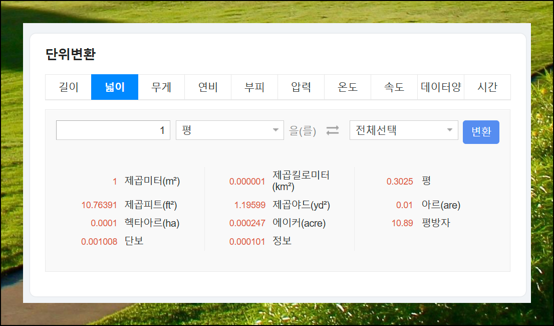 토지나 주택 면적을 산정할 때 유용한 넓이 환산도 가능합니다. 평방자까지 11가지 다양한 크기 표현을 자유롭게 바꿀 수 있답니다.